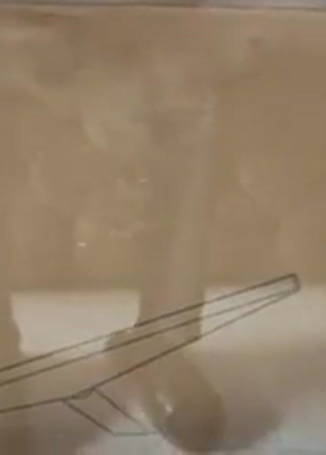 person in a room. The camera pans from a Starlink box to a clear shelf with items behind it, and then back to the Starlink box, then pans to the left showing a face editing app on a phone, and back to the Starlink box. The shelf holds several objects including a black video game controller with a light blue and white design, a stack of video games, a black box wrapped in plastic, and a green plastic cup. A black office chair is visible behind the shelf.