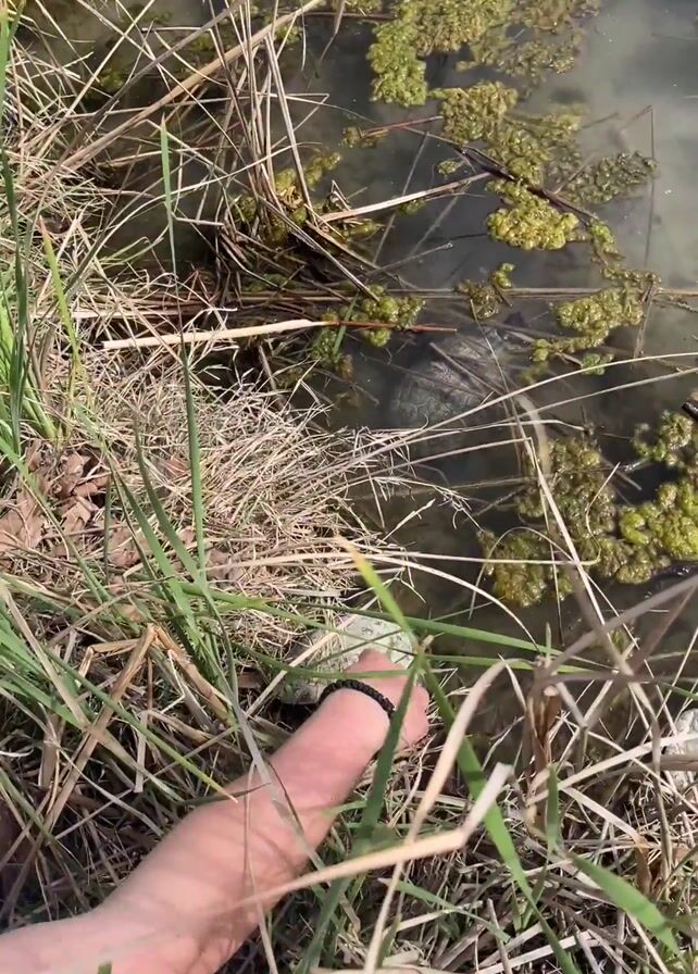 A person's hand reaches into a shallow pond, covered with pond scum and weeds, to touch a white stone near the edge. The hand is tan and wearing a bracelet, and the pond is surrounded by tall grass and reeds. A turtle can be seen in the water farther in the background.