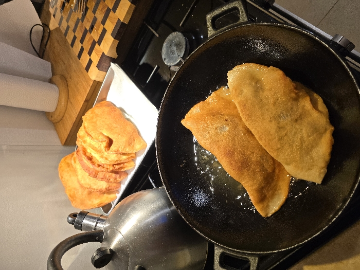 This image depicts a kitchen scene in Even Yehuda, Israel, centered on the preparation of fried food