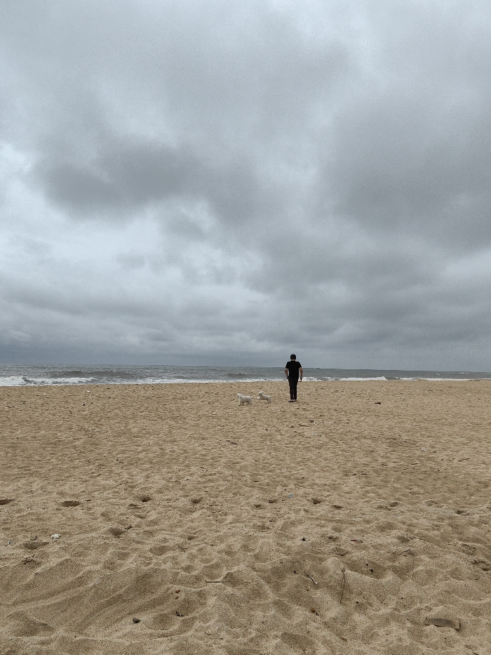 A sandy beach in Thuận An Ward, Vietnam, is depicted under an overcast, heavily clouded sky. In the midground, an adult male, seen from behind, wearing a dark shirt and dark pants, walks towards the ocean. He is accompanied by two small, white dogs walking ahead of him. The beach consists of light brown sand with visible footprints and minimal scattered debris. The background shows the ocean with moderate waves breaking into white foam along the shoreline.