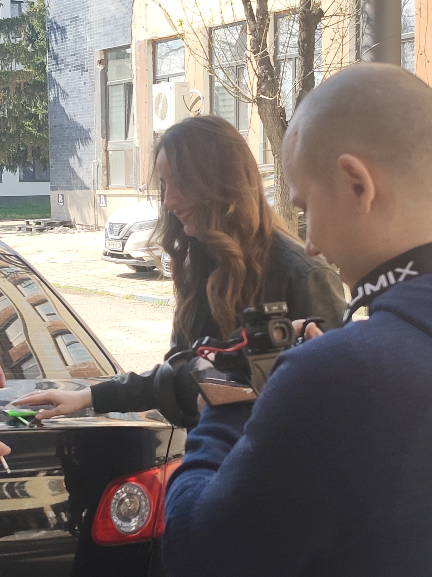 A person with long brown hair is smiling while leaning on the back of a black car. A second person with a shaved head is holding a camera with a "LUMIX" strap, likely filming the first person. The car's rear light is visible, and someone's hand is touching the car with a green object. In the background, there is a building with windows and an air conditioning unit. Another white car is parked further behind. The photograph was taken outdoors in Plovdiv, Bulgaria.