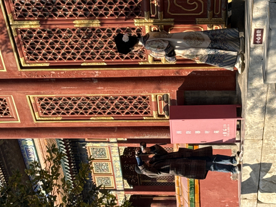 The image depicts an outdoor scene in Xicheng District, China, featuring traditional Chinese architecture under bright sunlight. Two individuals are present on a stone platform in front of a red building characterized by ornate wooden lattice doors framed in gold and large red pillars. On the left, an adult individual, wearing a dark plaid long coat, blue jeans, and a dark cap, is actively photographing, holding a black camera with a long lens directed towards the second individual. On the right, an adult female is posing, facing away from the photographer and towards the red building. She wears a long, cream-colored traditional Chinese robe with intricate gold, blue, and black embroidered patterns, and modern white sneakers. Her dark hair is styled in an elaborate bun adorned with a white flower. Between the two individuals, a tall, narrow, red metal box labeled "消防器材箱" (Firefighting Equipment Box) and "火警119" (Fire Alarm 119) stands on the platform. A small sign on the ground in the foreground reads "小心台阶" (Mind the step). In the background, other traditional Chinese buildings with colorful tiled roofs and decorative eaves are visible through sparse foliage.