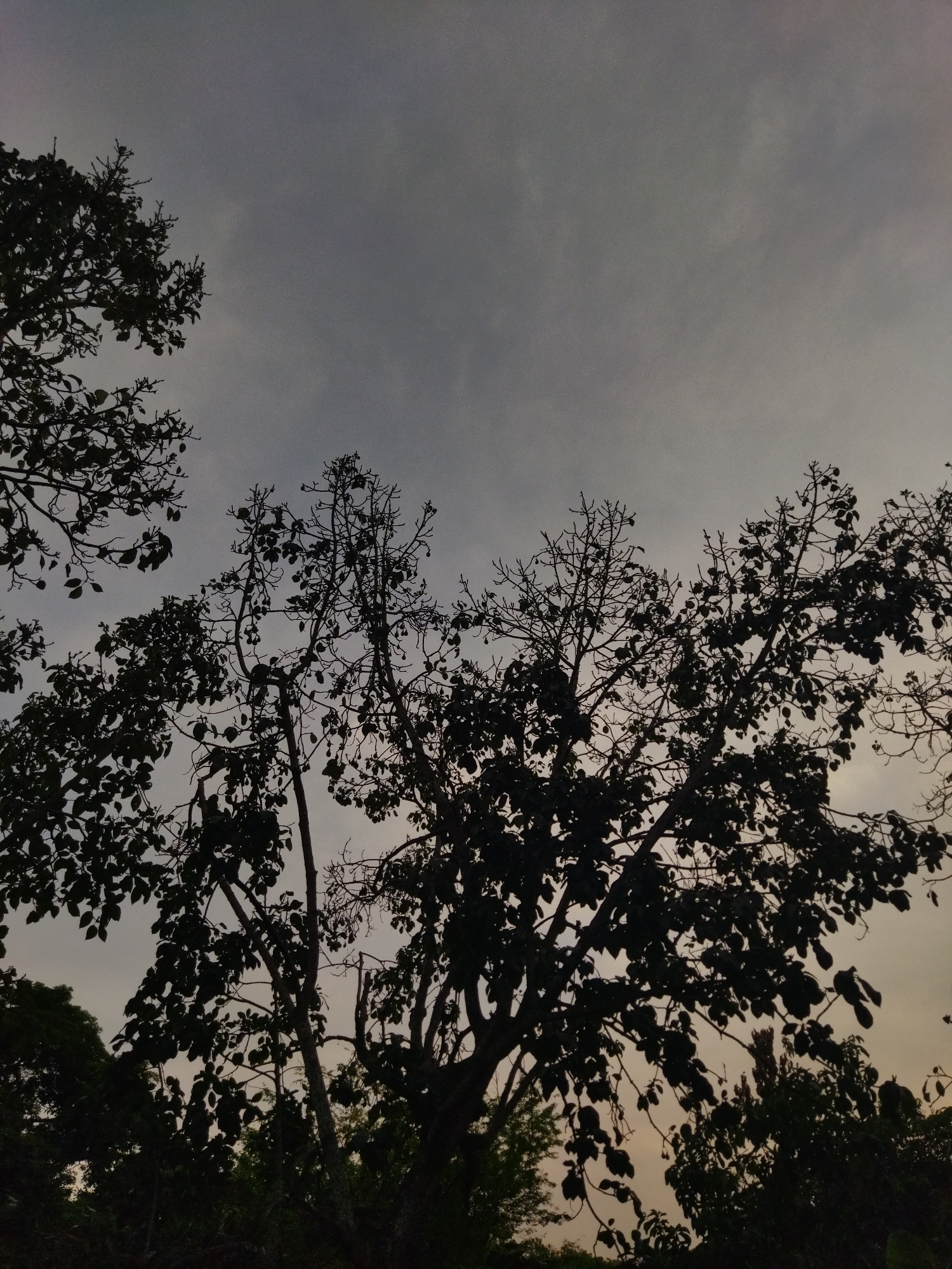 The photograph is a low-angle shot of trees silhouetted against an overcast sky. The sky is a gradient of grey, suggesting twilight or dusk. The trees are mostly bare branches, with some leaves still visible on some branches. The trees are in the foreground, with a line of trees visible at the bottom of the frame. The location is Tinaquillo, Venezuela.