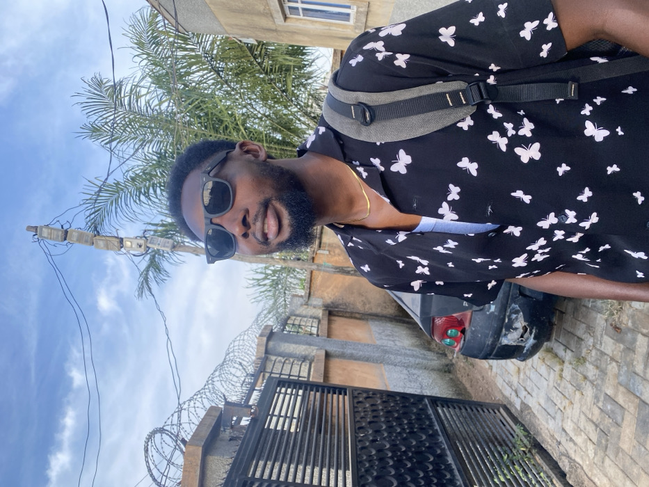 A man with a beard and sunglasses poses for a selfie. He wears a black butterfly-print shirt and a gray strap across his shoulder. A fence topped with barbed wire and a car are visible behind him. Overhead, there are palm trees and a blue sky with white clouds. An electrical pole stands beside the fence.