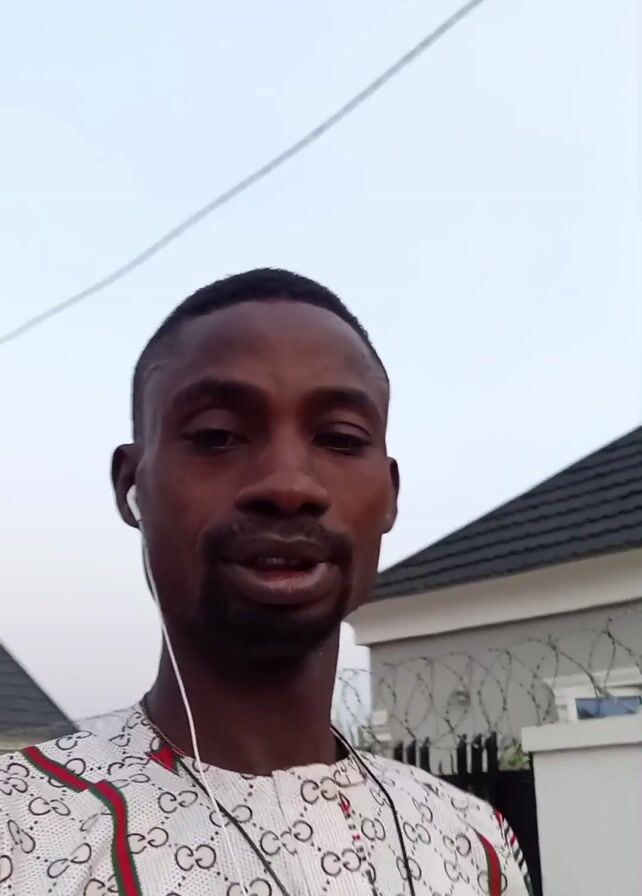 A medium shot shows an adult male with a dark complexion facing the camera while he walks along a street. He is wearing a white shirt printed with black interlocking "CC" patterns, which appear to be a Gucci logo, and decorated with green and red stripes along the collar and chest. He has short black hair, a mustache, and a thin beard. White earbuds are visible in his ears, with a white wire and a control hanging down from the left ear. He speaks directly to the camera. In the background are streetlights, houses with grey roofs and white walls, and an overcast sky. There's a powerline cutting across the top of the frame. The camera appears to be handheld, causing some slight movement.