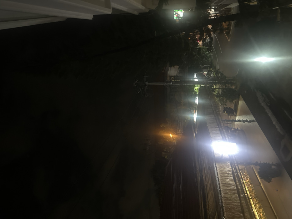 The image captures an elevated nighttime view of a street and surrounding structures in Tibubeneng, Indonesia. The sky above is dark and appears overcast. Multiple artificial light sources illuminate the scene, creating bright flares and reflections. In the immediate foreground on the right, the edge of a white building or balcony railing is visible, indicating the elevated perspective. To the left, a long building with a corrugated or textured roof runs parallel to the viewer, with a fence-like structure composed of numerous vertical, light-colored elements (possibly bamboo or reeds) in front of it. A prominent, elongated white light source intensely illuminates the area directly in front of this fence-like structure. Several motorcycles are partially visible, parked near this structure on the left side. A paved road or pathway curves from the center-right into the mid-distance. A large utility pole, laden with multiple overhead wires, stands centrally in the midground. Dense trees and foliage line the road and obscure views of additional background structures. On the far right, a rectangular, vertically oriented illuminated sign displays vibrant green and red colors. No individuals or explicit activities are discernible within the frame.