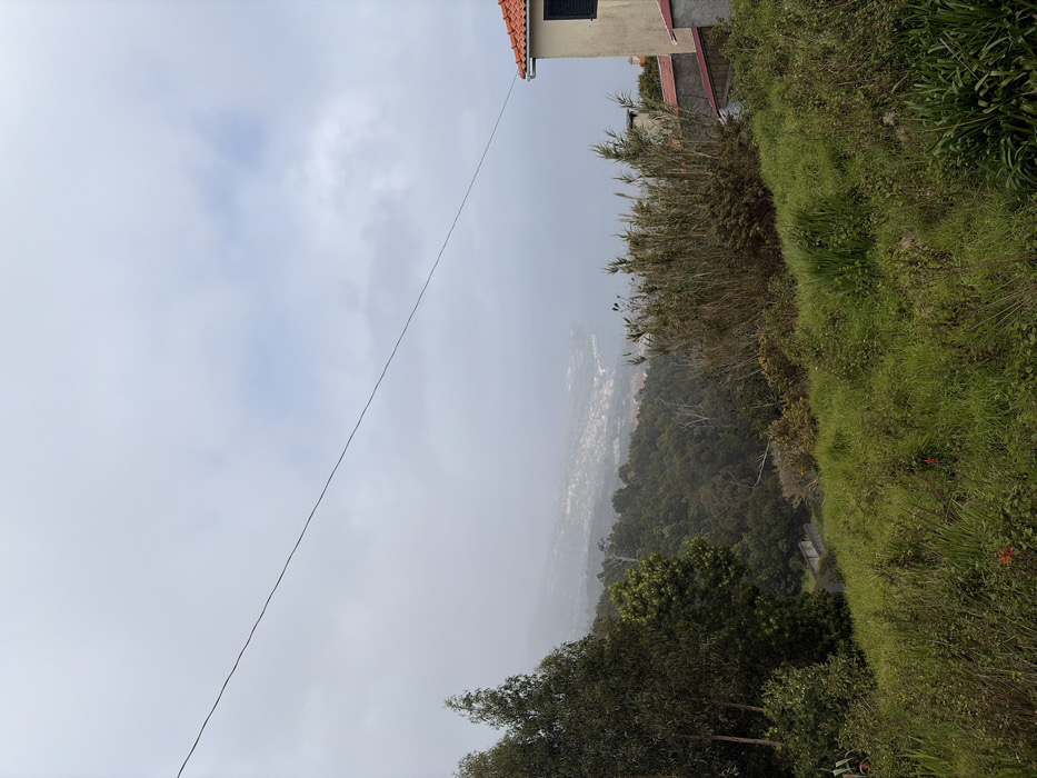 An outdoor scene in Santa Cruz, Portugal, depicts a descending hillside view under an overcast sky with patches of lighter clouds. A thin, dark utility cable runs diagonally across the upper portion of the frame from top-left to mid-right. The foreground consists of a steep, unkempt grassy slope with various green shrubs and some small reddish flowers. In the midground, dense, dark green trees and bushes cover the undulating terrain. A light-colored building with an orange-tiled roof, a dark louvered shutter, and a white gutter is partially visible on the right, situated on the slope. Below this structure, additional orange-tiled rooftops are discernible. In the background, partially obscured by mist or fog, a coastal town identified as Santa Cruz extends towards the sea, which appears as a muted grey-blue mass. No individuals are present, and no actions or interactions are depicted.