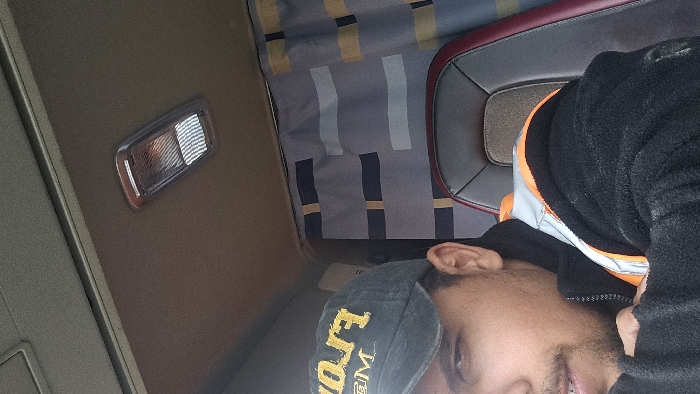 The image depicts the interior of a vehicle, likely a commercial truck or large van