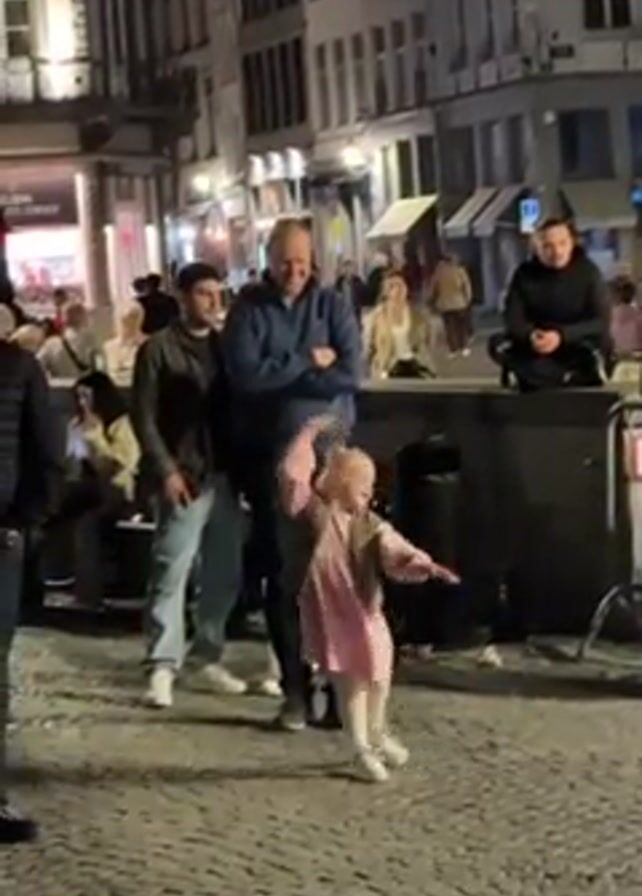 cobblestone square in an unidentified European city, at night. The buildings are well-lit and there are several people standing or sitting around. A young girl wearing a pink dress and vest is dancing in the center of the square. Several adults watch her, some smiling and taking pictures. One man stands with his arms crossed, watching. The lighting is bright, and the scene is casual and friendly.