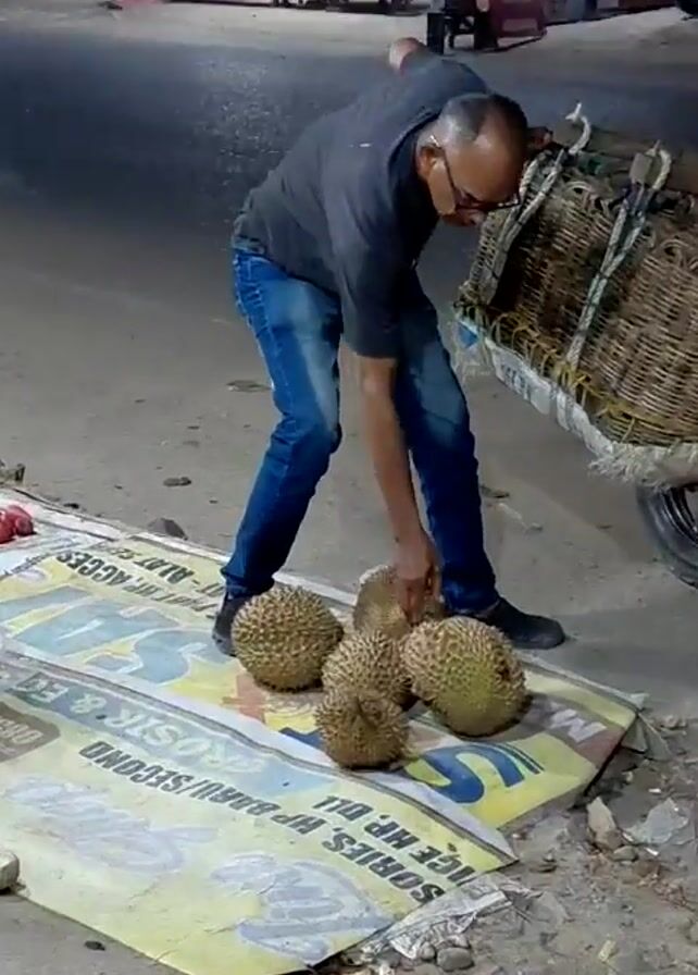 At night on a brightly lit sidewalk, a middle-aged man wearing a dark shirt and blue jeans sets down a large durian fruit on a piece of advertising canvas displaying fruit for sale. Three more durian sit on the canvas as well. The man has a large wicker basket attached to the back of a motorcycle parked near the fruit. Further back is a street crowded with food vendors.