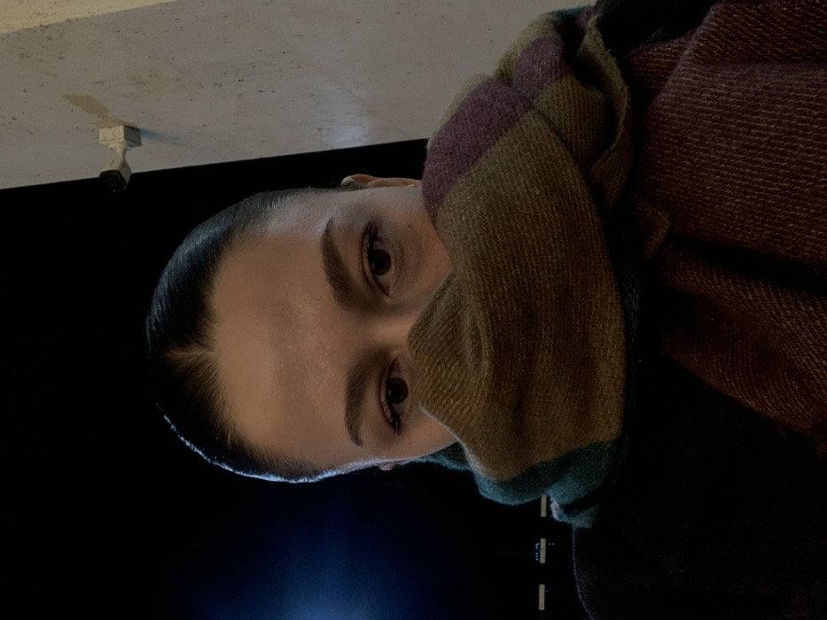 A person with dark hair pulled back is pictured from a low angle, the view tilted to the side. Their face is partially obscured by a thick, multi-colored scarf of brown, burgundy, purple, and green hues. The background is dark, possibly night, with a security camera attached to a light-colored surface visible in the upper left corner. The overall lighting is dim, creating a stark contrast between the light and dark areas.