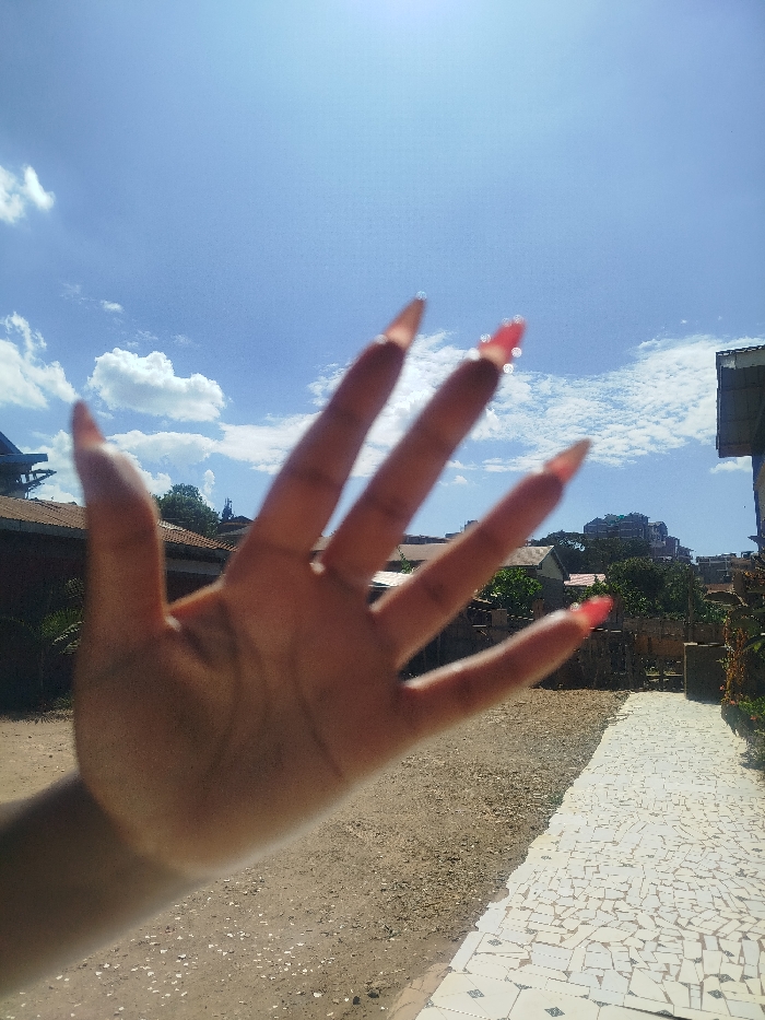 The image depicts an outdoor, daytime scene in Nairobi, Kenya, under a bright blue sky with scattered white cumulus clouds. In the immediate foreground, a human hand, likely the left, is extended towards the camera, slightly out of focus. The hand has five splayed fingers, each adorned with a long, pointed, clear or translucent acrylic nail featuring a reddish-pink tip. The palm of the hand is partially visible. The midground features the ground surface, divided into two distinct areas. To the left, there is an unpaved expanse of dry, light-brown earth mixed with small stones and gravel. To the right, a pathway is constructed from irregularly shaped pieces of white and light-colored ceramic tiles, creating a mosaic pattern. In the background, a residential or mixed-use urban landscape is visible. Low-rise buildings with reddish-brown corrugated iron or tiled roofs are present, interspersed with green foliage from trees and bushes. In the further distance, taller, indistinct multi-story buildings suggest a more developed urban area. A bright light source, presumably the sun, is high in the sky, casting intense illumination and producing a minor lens flare in the upper right quadrant of the image. No other individuals are present in the visible scene.