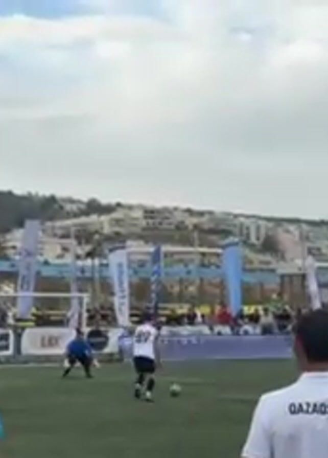 A soccer player wearing a white jersey with the number 89 kicks a soccer ball toward a goal. A goalkeeper wearing a black jersey attempts to block the shot. A person wearing a turquoise shirt labeled “VOLUNTEER” stands on the left of the frame. A person wearing a white jersey that reads “QAZAQSTAN” stands on the right of the frame with their back facing the camera. People watch from behind barriers. Banners, a white tent, and buildings are visible in the background.