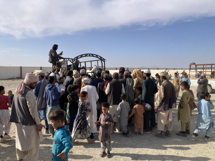 An outdoor scene in Chaman City Tehsil, Pakistan, depicts approximately 50-70 individuals, primarily adult men and children of various ages, gathered on dry, unpaved ground under a clear blue sky