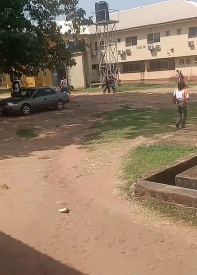 n outdoor scene. A car is parked near a building. Several individuals are walking or running in the grassy area in front of the building. A water tower stands next to the building. The ground is a mix of dirt and grass. A person in a white shirt and orange vest is walking towards the camera.
