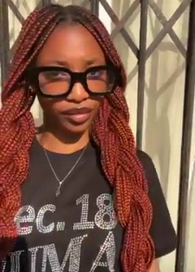 A young Black woman with reddish-brown box braids styled in low pigtails stands in front of a metal security gate
