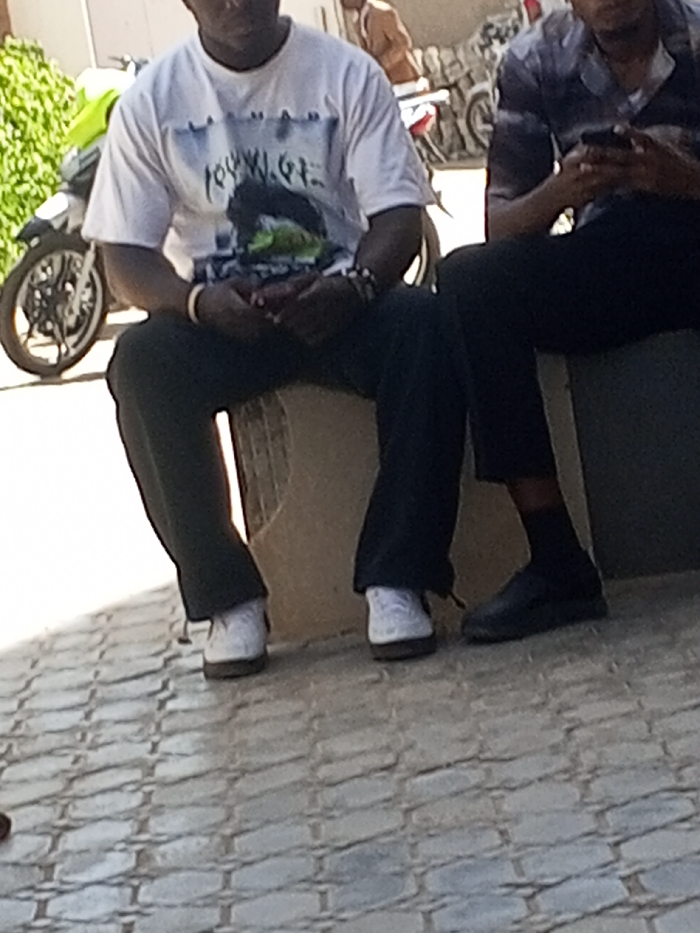 Two individuals are seated outdoors in Sabon Gari West, Nigeria
