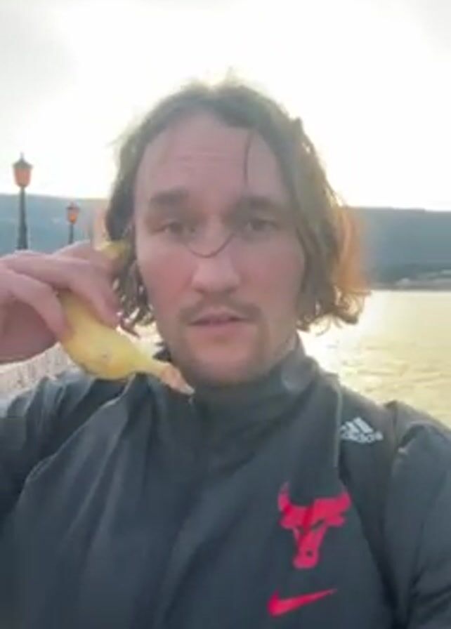 man with brown hair standing by a body of water, holding a banana to his ear as if it were a phone. He’s wearing a black Adidas jacket with a red Chicago Bulls logo. He asks, "Слышно?" ("Can you hear me?") and then says "Алло" ("Hello"). The background includes a coastline with buildings and a lamp post. The lighting suggests it's dusk or dawn. He smiles and laughs during the video.