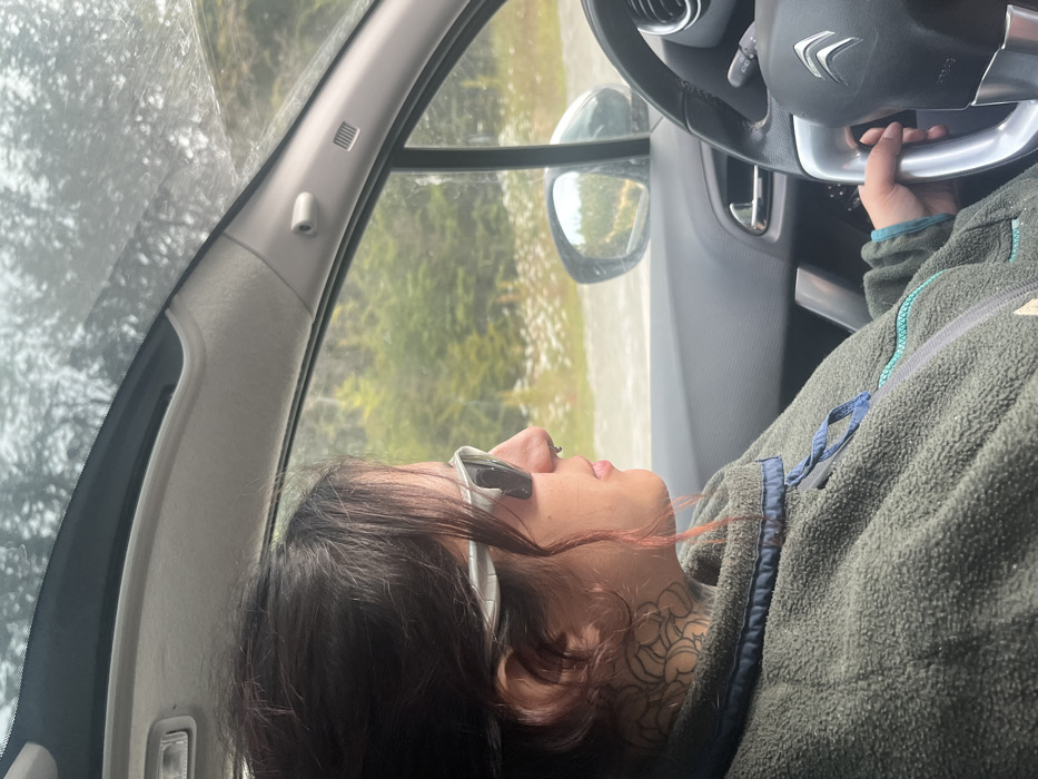 A female individual is depicted in the driver's seat of a vehicle, identified by its steering wheel as likely a Citroën, at an unspecified location in Unknown, Argentina. She has dark hair, wears light-colored sunglasses, a nose ring, and a floral tattoo on the left side of her neck. Her attire consists of a dark green fleece jacket with blue trim. Her right hand is positioned on the steering wheel. The vehicle's interior displays a light-colored headliner and A-pillar. The external environment, visible through the windshield and driver's side mirror, features dense green foliage and trees, with some white ground cover, indicative of a rural or wooded area under diffuse lighting. The windshield exhibits some streaking or dirt.