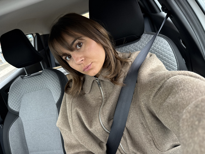 An adult female is depicted seated inside a vehicle, taking a selfie. She has medium-brown hair with bangs and shoulder-length waves, and is wearing a textured light brown or tan jacket with a silver zipper partially open at the collar. A dark gray seatbelt is fastened across her chest. The vehicle's interior features two-tone seats: black with gray diamond-quilted inserts on the upper backrests and solid gray lower portions. The front passenger seat is partially visible to the left. The background visible through the vehicle's windows is blurred, indicating an outdoor or urban setting. This scene is located in the city of Veauche, France.