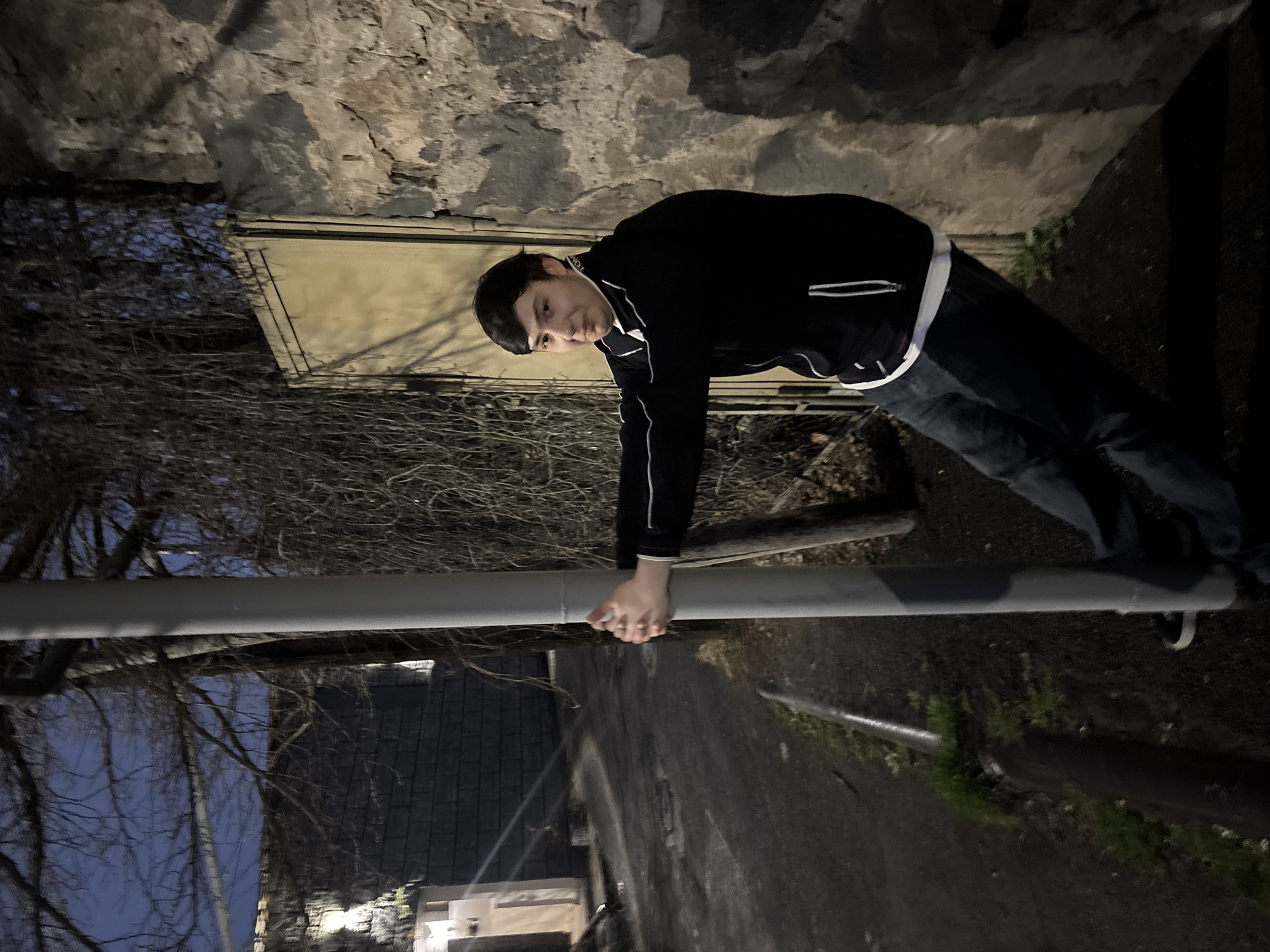 A person stands against a textured stone wall in an outdoor setting at night. The individual, wearing a dark jacket with light trim and dark pants, is leaning on a grey metal pipe. The background includes bare trees and hints of a building with a dark roof. The location is in Yerevan, Armenia.