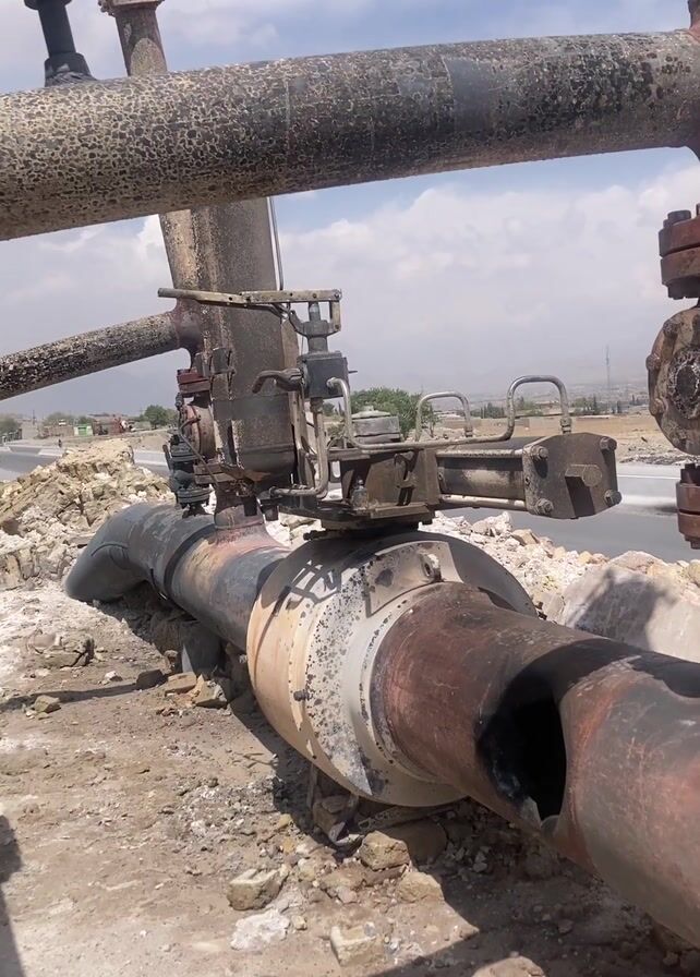 large, old, rusty pipes connected with valves and flanges, sitting on a bed of dirt and rocks near a paved road. One of the pipes has a large hole in it. The sky is visible with some clouds. In the background, there are distant buildings and a road with vehicles. The scene appears to be outdoors and possibly an industrial site.