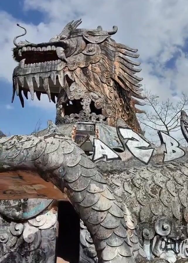 dilapidated dragon sculpture at what appears to be a defunct amusement park. The dragon is made of concrete and has been covered in graffiti. The video pans to reveal that the dragon is part of a bridge or structure that leads to a small lake. In the background, there are trees and some other structures. The sky is partly cloudy. There is a platform extending into the lake, and a gazebo-like structure is on an island on the other side. Some people are standing around the gazebo.