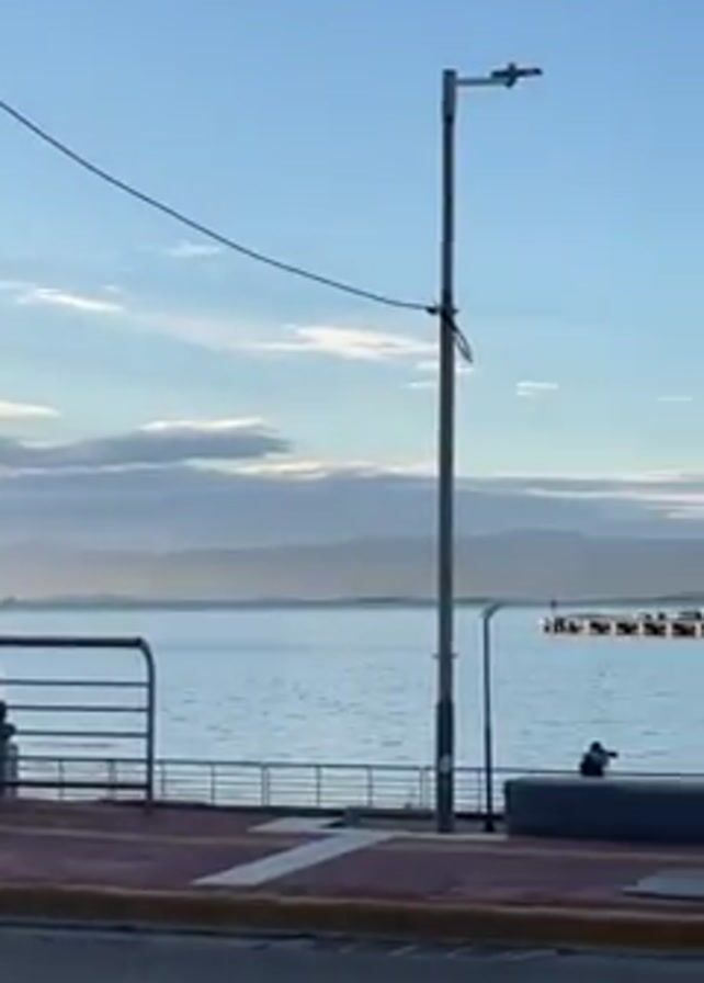 The video presents a harbor scene. The camera pans from left to right to reveal a railing along the waterfront, with distant mountains visible across the water. A cruise ship is docked at the harbor. The sky is blue with scattered clouds, and the water is calm. A street with red and yellow markings is in the foreground. A person is visible sitting on the edge of the waterfront. There are lampposts and a small structure with the text "Cumplimos" in the harbor area.