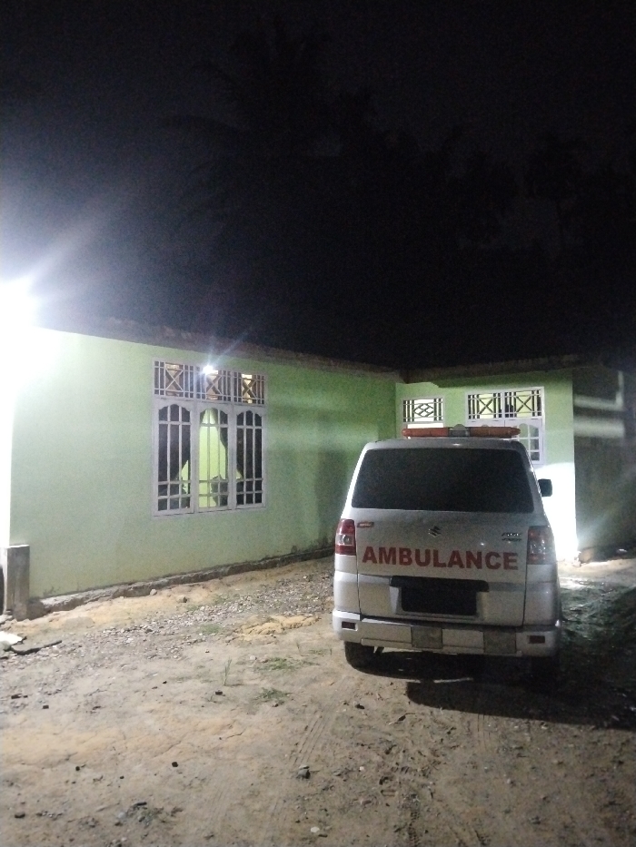 The image captures a nighttime scene in the city of Unknown, Indonesia. A silver-white van, marked as an "AMBULANCE" in red capital letters across its rear tailgate and equipped with an orange emergency light bar on its roof, is parked on an unpaved dirt and gravel surface. The vehicle is oriented with its rear towards the viewer, situated in front of a light green, single-story building. The building features several white-framed windows, some adorned with decorative grilles, through which internal light is emanating. A bright artificial light source, positioned to the left of the frame, illuminates the building's facade and portions of the ground. The sky is dark, with faint outlines of foliage visible at the top. No individuals are present within the depicted scene.