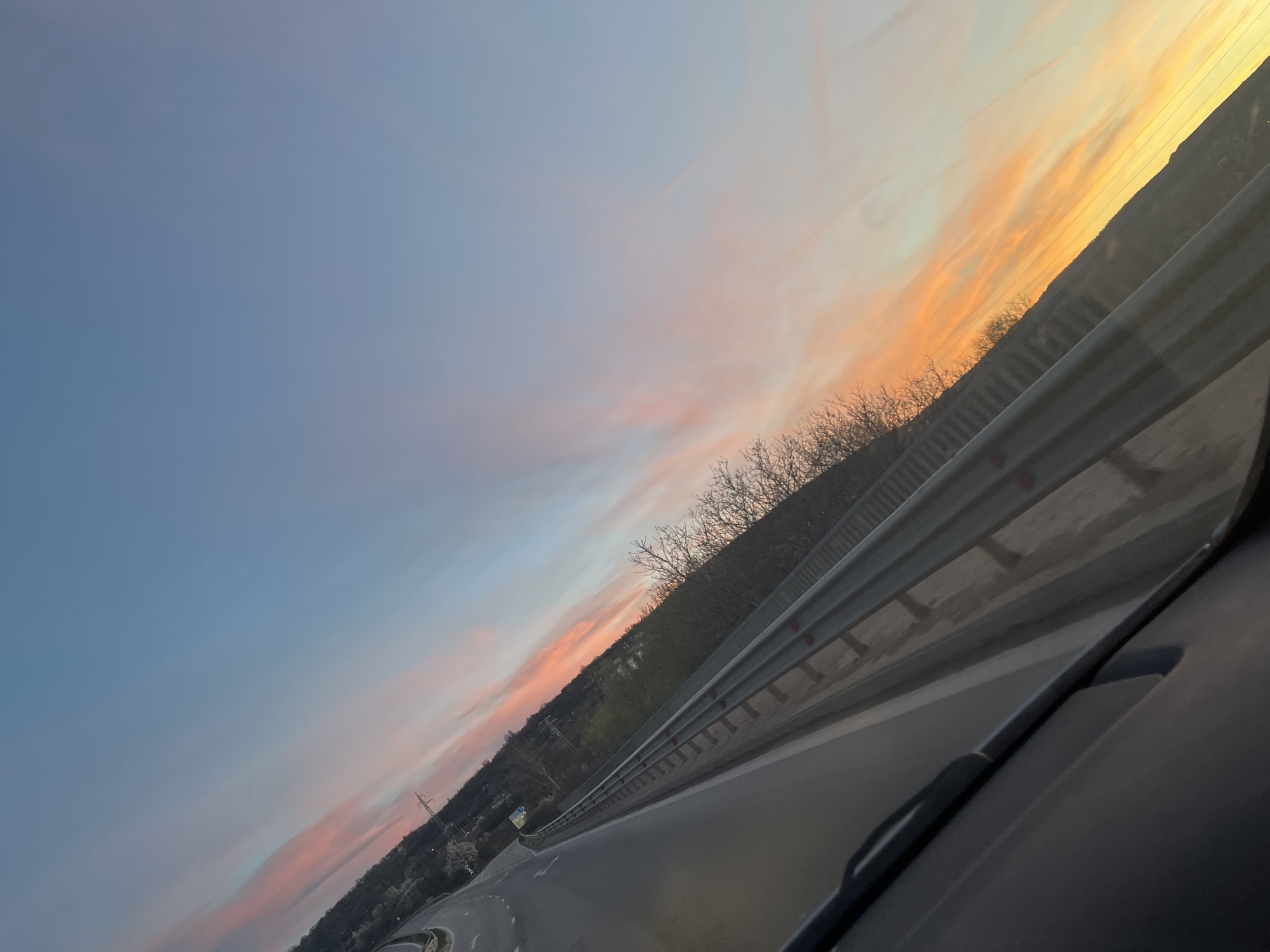 view from inside a vehicle, likely a car, driving on a highway near Lovech, Bulgaria. The road curves to the left and is lined with a metal guardrail. Beyond the guardrail is a hillside with trees and some buildings visible in the distance. The sky is a gradient of blue, pink, orange, and yellow, indicating either sunrise or sunset. The photo is taken at an angle.