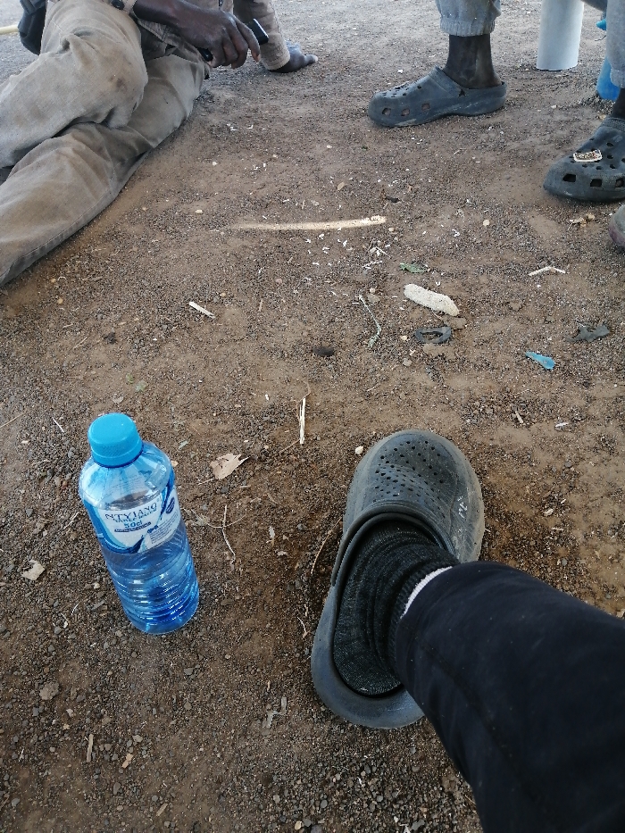 The photo shows a ground-level view of an outdoor area covered in dirt and small rocks. A water bottle is on the left side of the frame. Two people are visible, one lying down with their pants and arm in view, and another sitting. The seated person is wearing grey pants and sandals, with their feet visible. The photo is taken from a low angle, as seen by the person wearing black pants and a black sandal on their right foot.
