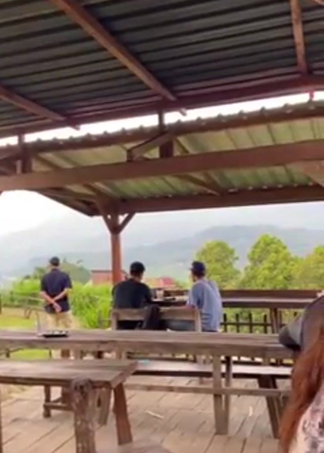 n open-air wooden structure with a corrugated metal roof, containing several wooden tables and benches. People are sitting and standing around the tables, some interacting with their phones. Through the open side of the structure, a green landscape with trees and distant mountains is visible under a cloudy sky. Some of the vegetation includes banana trees. The camera slowly pans to the right, focusing on the landscape.