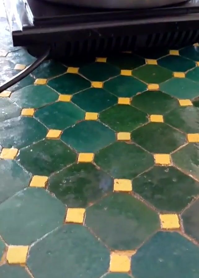 A steaming pot of stew sits on a black hot plate on a green and yellow tiled table