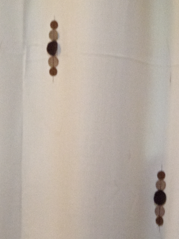 The image displays a light-colored, textured fabric surface, likely off-white or cream. Two distinct vertical arrangements, each composed of five circular elements resembling beads, are affixed to the fabric. The upper arrangement is situated left of the image center, and the lower arrangement is located right of the image center. Each sequence consists of an alternating pattern of brown and tan colored beads, with a darker brown or black bead positioned centrally within each set of five. Minor folds and slight variations in lighting are present on the fabric surface. No individuals, actions, or specific environmental details beyond the textile itself are discernible. The precise location within Ijoko, Nigeria, cannot be determined from the visual information provided in this image.