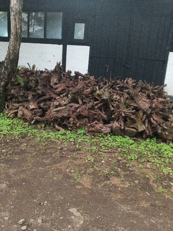 This scene, located in the city of Candelaria, Philippines, depicts an outdoor area adjacent to a structure. A substantial, irregularly shaped pile of assorted tree roots, stumps, and cut wood sections, exhibiting dark brown, reddish-brown, and greyish-brown hues, dominates the midground. This woody material rests upon a strip of vibrant green ground cover. The foreground consists of dark brown, unpaved earth scattered with small stones and sparse light green vegetation. To the left, a single, greyish-brown tree trunk with textured bark stands vertically. In the background, a building features a dark grey or black upper section with three rectangular windows—two larger on the left and one smaller on the right—above a white lower wall section. A dark-colored door or double doors are visible within the central dark portion of the building. The scene is static under diffused lighting conditions; no individuals or active interactions are present.