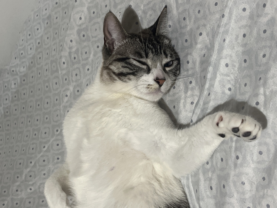 - "A domestic cat is resting on its back on a light grey patterned bedspread" by FM-O7LmK2, licensed under CC BY 4.0