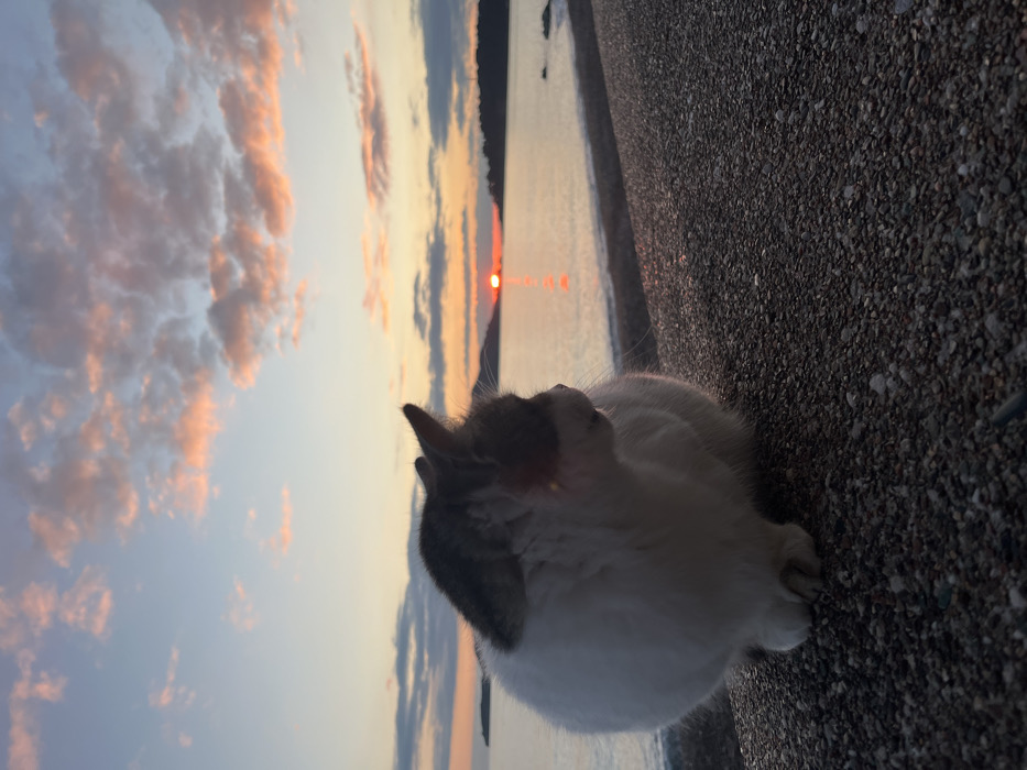 A domestic cat is situated on a dark, coarse-grained pebbled surface at a coastal location in Bečići, Montenegro. The feline, predominantly white with distinct dark grey or brown patches on its head, back, and ears, occupies the lower-left section of the image, seated and oriented to the right, looking towards the horizon. The setting sun, appearing as an intense orange-red disk, is visible low on the horizon over the sea in the mid-right background. A shimmering vertical reflection of sunlight extends across the water from the sun towards the foreground. Dark, silhouetted landmasses, possibly islands or distant hills, frame the sun on the horizon. The sky above transitions from light blue at the top to warm orange, pink, and yellow tones near the horizon, with scattered clouds illuminated by the sunset. A narrow strip of pebbled beach or shoreline separates the water from the foreground surface where the cat rests. No other individuals or significant objects are present.