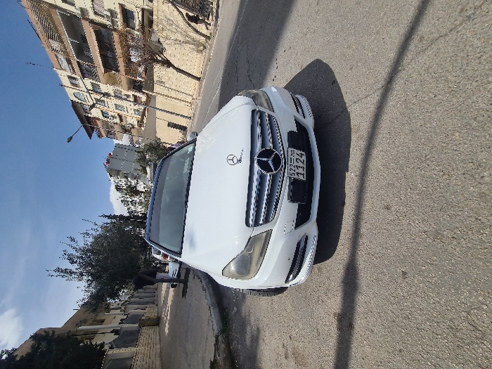 The scene depicts an urban street in Barza Municipality, Syria, on a clear day. A white Mercedes-Benz C-Class sedan (likely W204 generation) is parked on an asphalt road in the foreground, facing slightly left of the viewer. The vehicle has a black roof, a tinted windshield, and a prominent Mercedes-Benz star emblem on its chrome grille. A Syrian license plate, bearing the partial provincial code "522" and the numerical sequence "1124," is mounted on the front bumper. To the immediate left and rear of the Mercedes, a single individual dressed in dark clothing is observed in a bent posture, appearing to attend to an object near the rear of the white sedan or an adjacent, partially visible white vehicle. Further left, residential buildings with light-colored facades and green foliage line a sidewalk behind a retaining wall. To the right of the parked car, the asphalt road continues uphill. A substantial, light-colored stone or concrete retaining wall supports higher ground, above which multiple multi-story residential buildings with balconies ascend a hillside. A street lamp post is visible mid-distance on the right. A second individual, also in dark attire, is visible near the base of the right retaining wall in the far background, appearing to walk or stand. The sky above is clear blue with scattered white clouds, casting distinct shadows on the road.