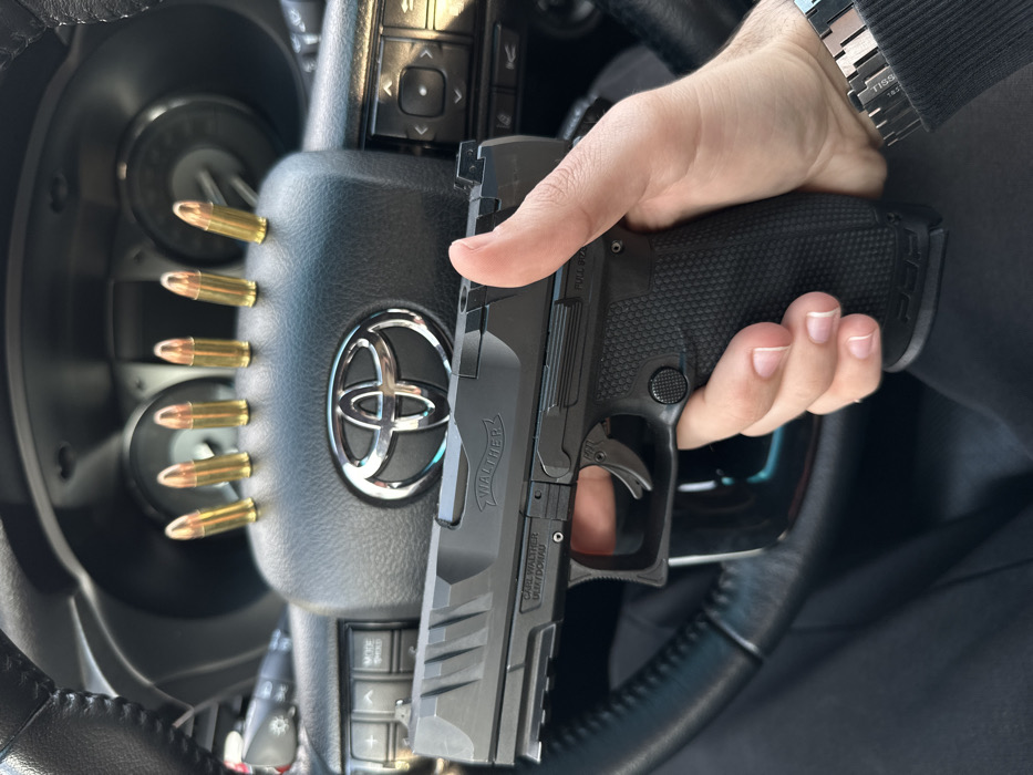 An interior vehicle scene depicts a light-skinned individual's right hand gripping a black Walther brand semi-automatic pistol