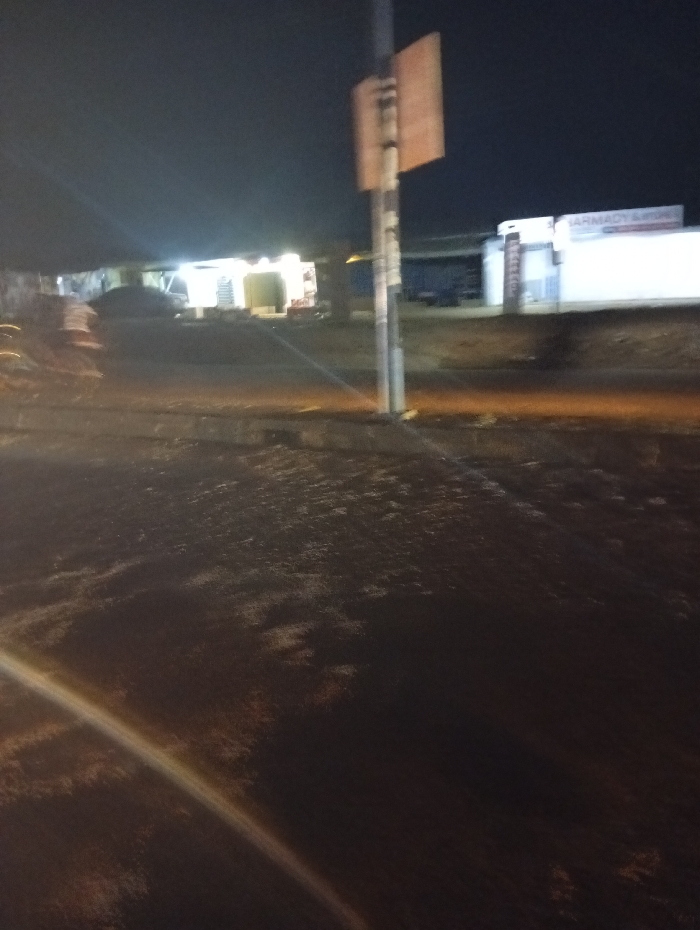 Night scene shows a dimly lit street. A utility pole stands in the middle ground with a sign attached. Brightly lit storefronts are visible on either side, including what appears to be a pharmacy. A vehicle is parked near one of the stores. The road surface is dark and uneven.