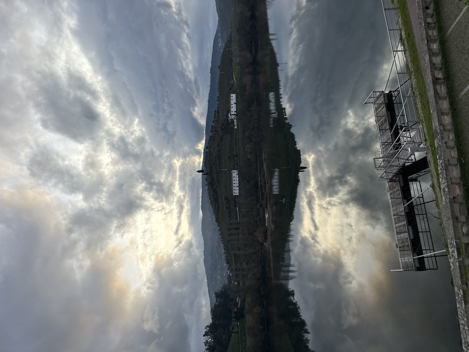 An inverted landscape reflects in dark water. A stretch of land topped with green trees and white buildings is bisected by the water's edge. Above, a textured sky of grey and white clouds dominates. The reflection mirrors the scene perfectly, blurring the line between reality and its mirrored image. A metallic structure with stairs is visible on the right edge, adding a man-made element to the otherwise natural scene.