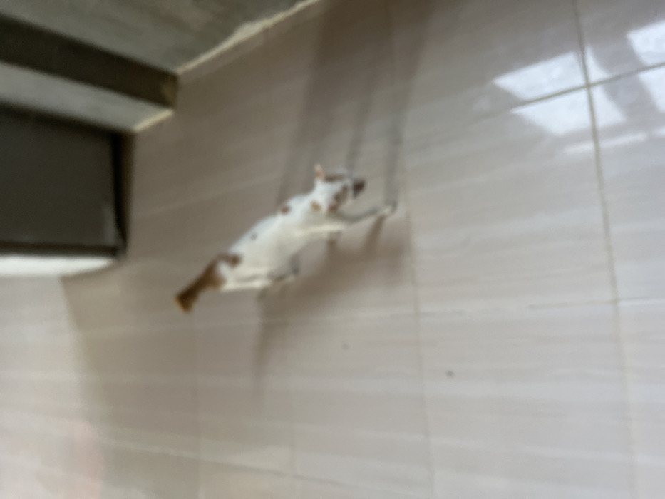 The scene depicts an indoor environment in Pulorayeuk, Indonesia, featuring a single feline subject. The floor consists of light-colored, square tiles. A domestic cat, predominantly white with irregular light brown or orange-brown patches on its fur (notably on its back, tail, and head), is depicted in motion from the background towards the foreground, angled slightly right. Its head is lowered, and its gaze appears directed towards the floor. Shadows are cast on the tiled surface. A dark, rectilinear object, possibly a piece of furniture or an appliance, is partially visible in the upper-right background. The entire image is out of focus.