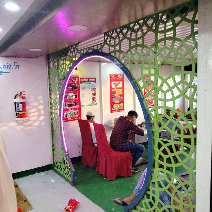 The interior of a restaurant features a green, patterned archway framing a dining area. Red chair covers adorn the seats where patrons are seated. A man in a red plaid shirt is at a table. Menus or advertisements hang on the wall. A fire extinguisher is visible near the entrance, with signage indicating directions. The floor appears to be green. The lighting is bright, with a purple hue near the ceiling.