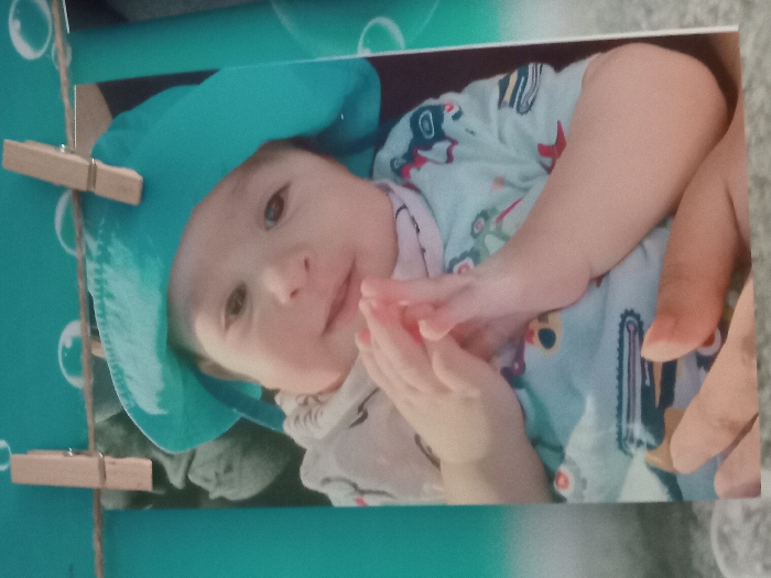 A printed color photograph of an infant is displayed, secured by two light-brown wooden clothespins to a thin horizontal string, set against a teal background patterned with white circular shapes. The infant, of light complexion, wears a teal bucket hat and a light blue long-sleeve garment featuring colorful, stylized motifs. The infant is depicted smiling, with both hands clasped together at chest height, partially supported by an adult's hand visible in the lower foreground. The immediate background within the infant's photograph is dark and indistinct. This scene is situated in the city of Meknes, Morocco.