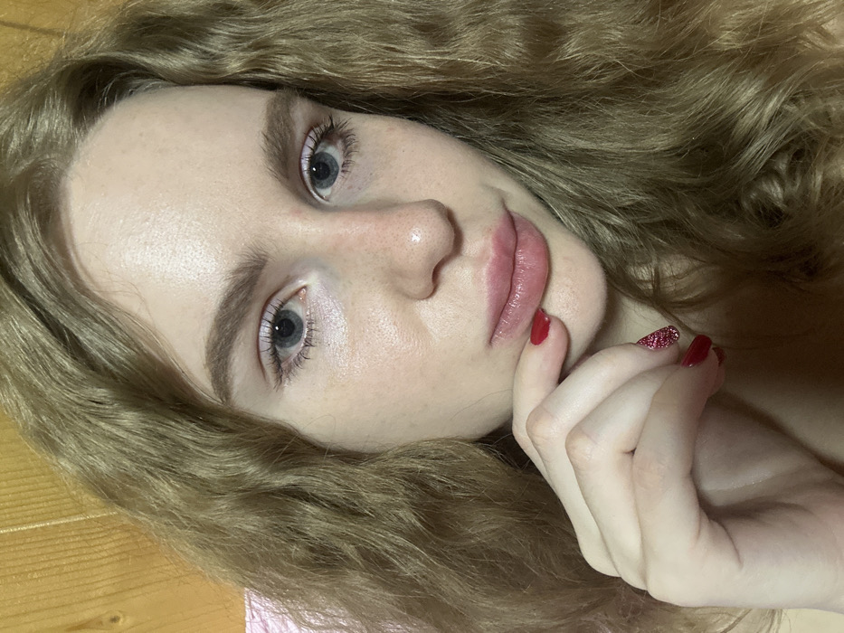 A close-up portrait of a female subject is depicted indoors in Vasilyevo, Russia. The subject has wavy light brown hair, blue eyes looking directly at the camera, and a fair complexion with visible freckles across the nose and cheeks. Her lips are full, pink, and appear glossy. Her right hand is positioned with fingers curled against her chin, and the nails are painted red, with the pinky finger featuring a glitter application. The background is out of focus, revealing a light brown wooden panel on the left and a pink surface behind her left shoulder.