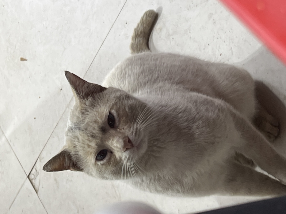 A light-furred cat lies on a white tile floor, looking upward toward the viewer. The cat's fur is mostly cream-colored, with some darker markings around the face. Its tail is curled upward. The cat's gaze is gentle, and it appears relaxed. Part of a red object is in the background.