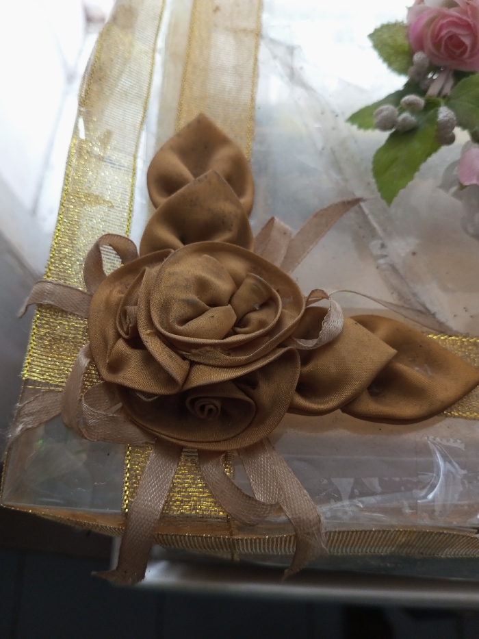 The scene depicts a close-up, elevated view of a decorative item, likely a gift package, located in Qarabucaq qəsəbə, Azerbaijan. The central subject is a transparently wrapped object, possibly a box, adorned with gold and tan fabric embellishments. A wide, textured golden ribbon runs along the left and bottom edges of the visible object. Overlaying this, a narrower, dull gold or tan satin ribbon is tied, forming loops and trailing ends. Centrally positioned are multiple fabric roses and petal-like forms constructed from the same dull gold/bronze satin material, exhibiting visible creases and minor discoloration. In the upper right quadrant, artificial pink roses with green leaves and frosted white berries or buds are visible underneath the transparent wrapping. The wrapping itself appears to be clear, crinkled plastic or cellophane. The background is an indistinct, light-toned blur, with a darker, out-of-focus surface at the very bottom edge of the frame. No individuals are present.