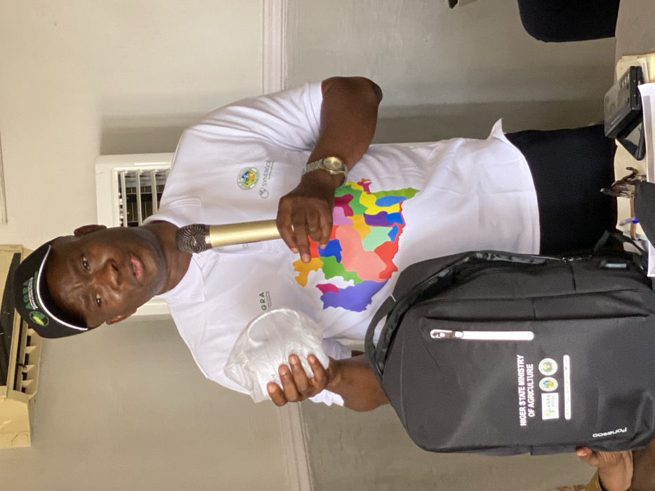 An adult male with dark complexion is captured indoors, specifically in Unguwar Rimi, Nigeria, mid-speech. He wears a black baseball cap featuring a green and white logo, a white polo shirt displaying a colorful map of Nigeria along with "AGRA" and "Synergos" logos, and a gold-colored wristwatch on his left wrist. His right hand holds a gold-colored microphone, while his left hand holds a crumpled white plastic item. A black backpack, branded "ponesoo" and bearing "NIGER STATE MINISTRY OF AGRICULTURE" text with accompanying "AGRA" and "Synergos" logos, is positioned in the lower-left foreground. Partially visible on a surface in the lower right are a black smartphone, a black flip phone, and some papers. The background consists of a light-colored wall with a white air conditioning unit mounted high on the left and a white louvered ventilation unit (possibly a standing fan or air purifier) on the right.