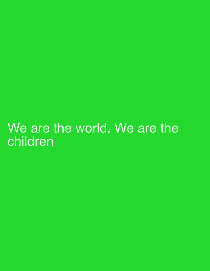 This image displays white sans-serif text against a solid, uniform green background. The text is horizontally centered and located in the lower-left quadrant of the frame. The first line of text reads "We are the world, We are the" and the second line reads "children". No people, additional subjects, objects, actions, or interactions are present. The environment consists solely of the green background and the overlaid text. The location is Unknown, Unknown.