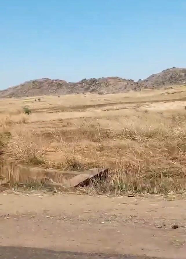 flat, dry landscape with sparse vegetation. The ground is predominantly dry grass and dirt, typical of an arid climate. A paved road is visible in the foreground. In the distance, there's a low, rocky hill or small mountain range. The sky is clear and blue, indicating a sunny day. The camera is moving, likely from a vehicle traveling along the road.